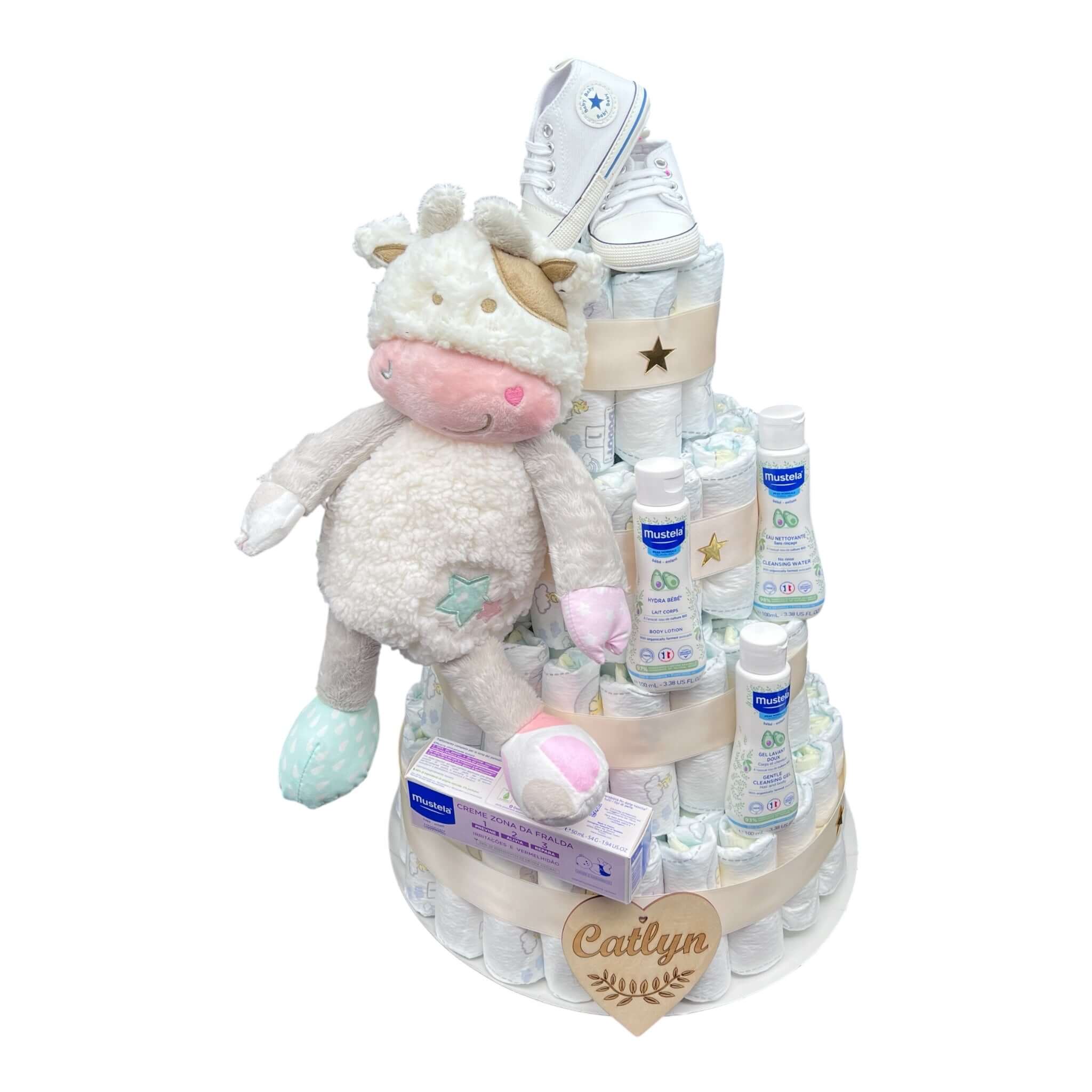 La cesta de pañales Mustela baby vaquita representa la mejor manera de dar la bienvenida al recién nacido. Elaborada con productos Mustela de reconocida eficacia dermatológica, esta cesta integra pañales Dodot de alta absorción con cuidados Mustela, específicos para la piel sensible del bebé.